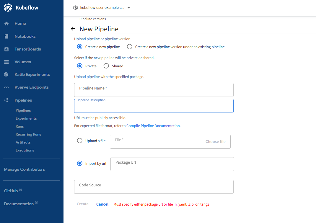 - Upload Pipeline: YAML 형식으로 작성된 파이프라인 정의 파일을 업로드하여 실행할 수 있도록 하는 기능