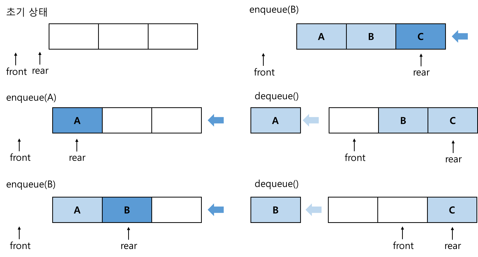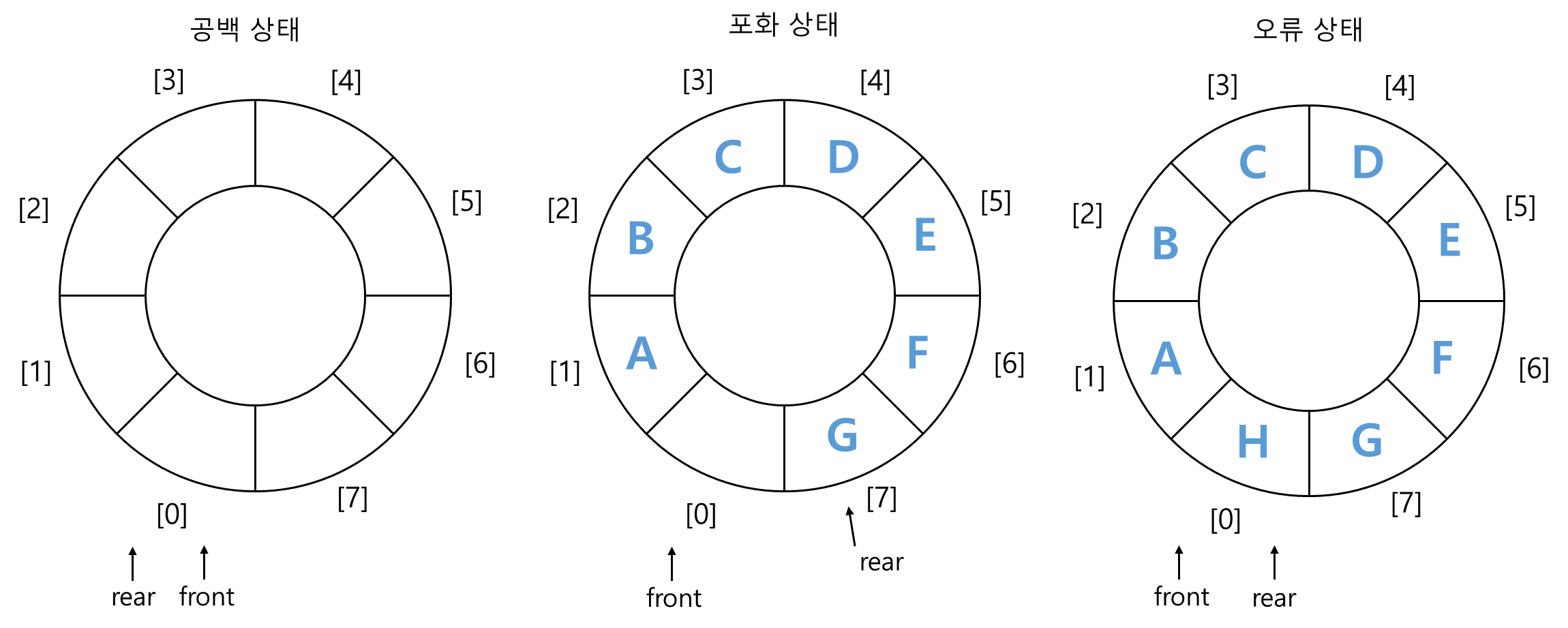 - front와 rear의 값이 같으면 공백 상태이고, 만약 front가 rear보다 하나 앞에 있으면 포화 상태가 됨.