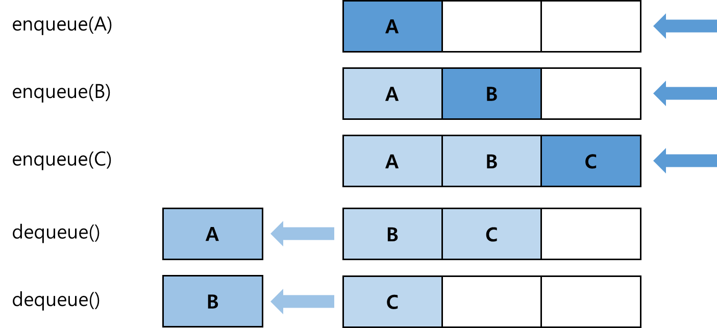 - 이러한 특성을 선입선출 (FIFO : First-In First_Out)임.