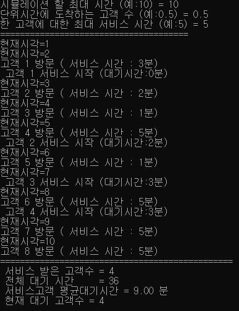 printf("한 고객에 대한 최대 서비스 시간 (예:5) = ");