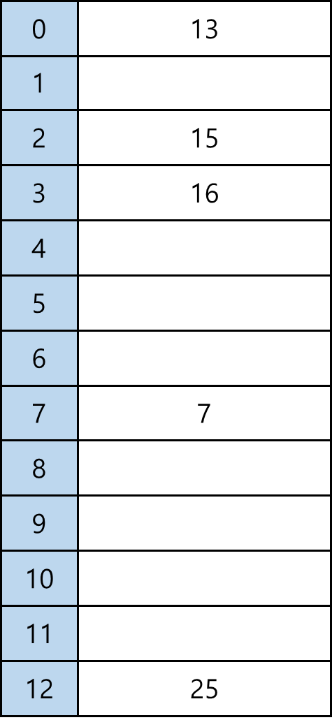 25, 13, 16, 15, 7을 차례로 저장한 예