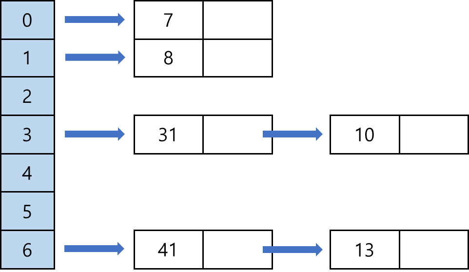 - 해시 테이블의 각 주소가 리스트의 헤더 역할을 하고, 여기에 해당 주소로 들어오는 원소들이 연결 리스트로 매달림.