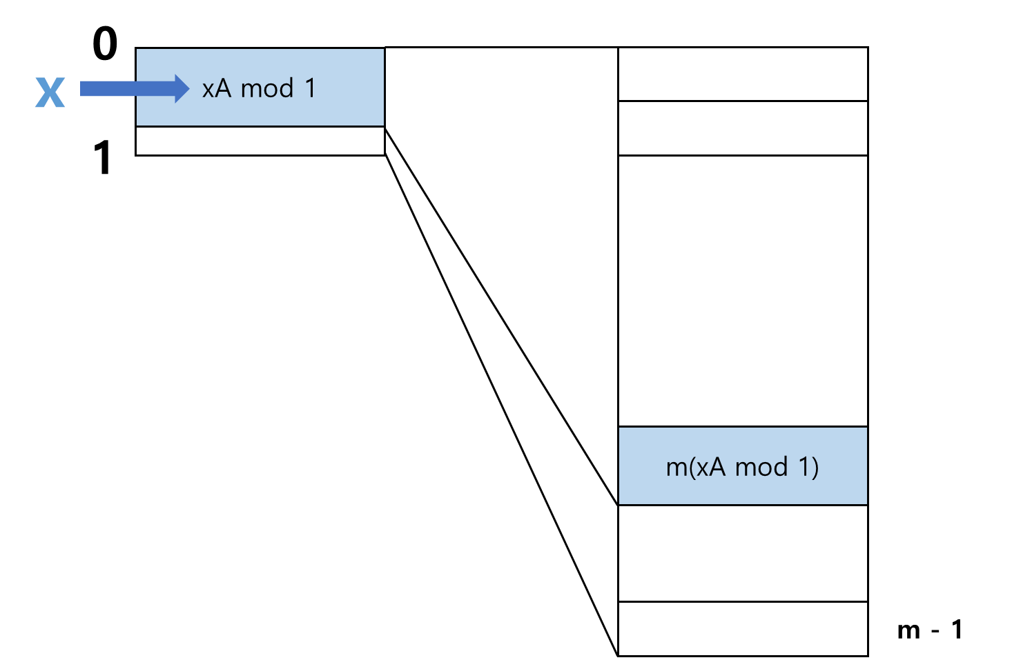 - 이 방법에서는 해시 함수의 특성을 결정짓는 0 < A < 1 범위의 상수 A를 미리 준비해 놓아야 함.
