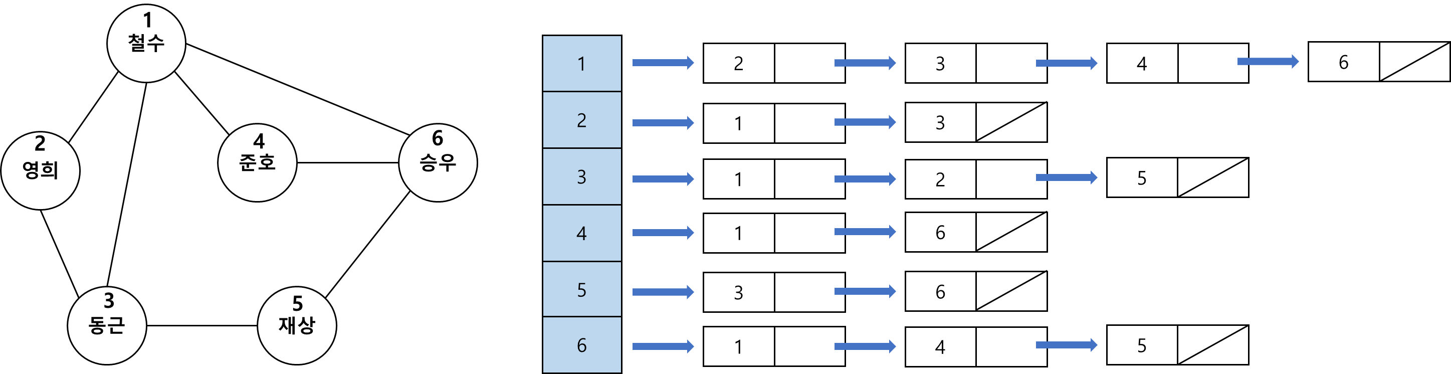 - 인접 리스트는 공간이 간선의 총수에 비례하는 양만큼 필요하므로 대체로 행렬 표현에 비해 공간의 낭비가 없음.
