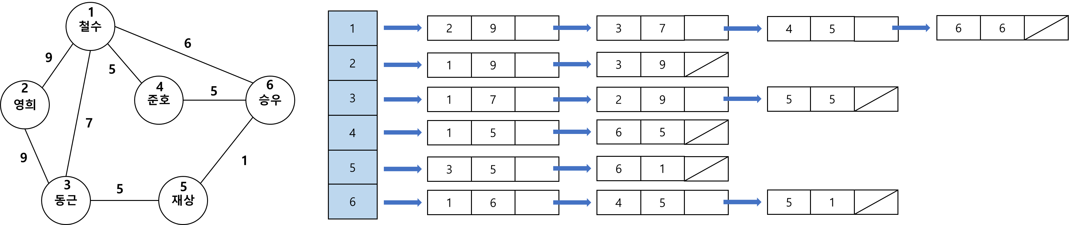 - 하지만 거의 모든 정점 쌍에 대해 간선이 존재하는 경우에는 오히려 리스트를 만드는 데 필요한 오버헤드만 더 들게 됨.