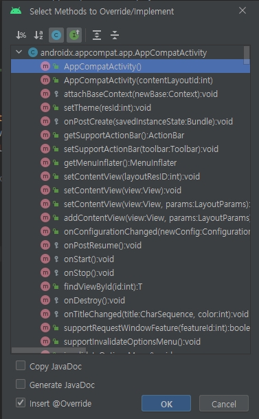 앱을 켜면 화면엔 EditText가 뜨게 됩니다. EidtText에 문구를 적고 앱을 종료하면 현재에는 작성했던 문구가 사라지게 됩니다. 이제 사라지지 않도록 해보겠습니다. onCreate아래에 컨트롤+'o'를 하게되면 다음과 같이 창이 뜨게 됩니다. 여기에 'onDestroy'를 입력하여 OK를 누르면 onDestroy라는 생명주기가 하나 만들어집니다. 이것은 앱을 종료했을 때, 정확하게는 이 액티비티를 벗어났을 때 액티비티가 파괴되는데 그때 호출되었을때 실행할 수 있는 것입니다. 이때 sharedPreferences를 이용하여 데이터를 저장하고 앱을 종료할 수 있도록 하는 것입니다. 그리고 onCreate를 실행할때 불러오는 것입니다.