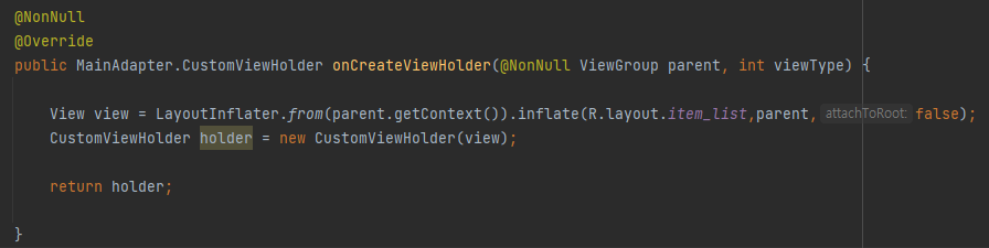 CustomViewHolder 클래스와 메소드에 다음과 같이 작성합니다.