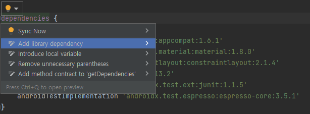 좌측의 Project 창에서 app - Gradle Scripts - build.gradle (Module :app)을 클릭하여 파일을 엽니다. 코드 아래쪽에 dependencies가 있는데 이 코드를 클릭하고 기다리면 전구가 뜨게 됩니다. 전구를 클릭하고 'Add library dependency'를 클릭하고 아래에 있는 것을 찾아줍니다.