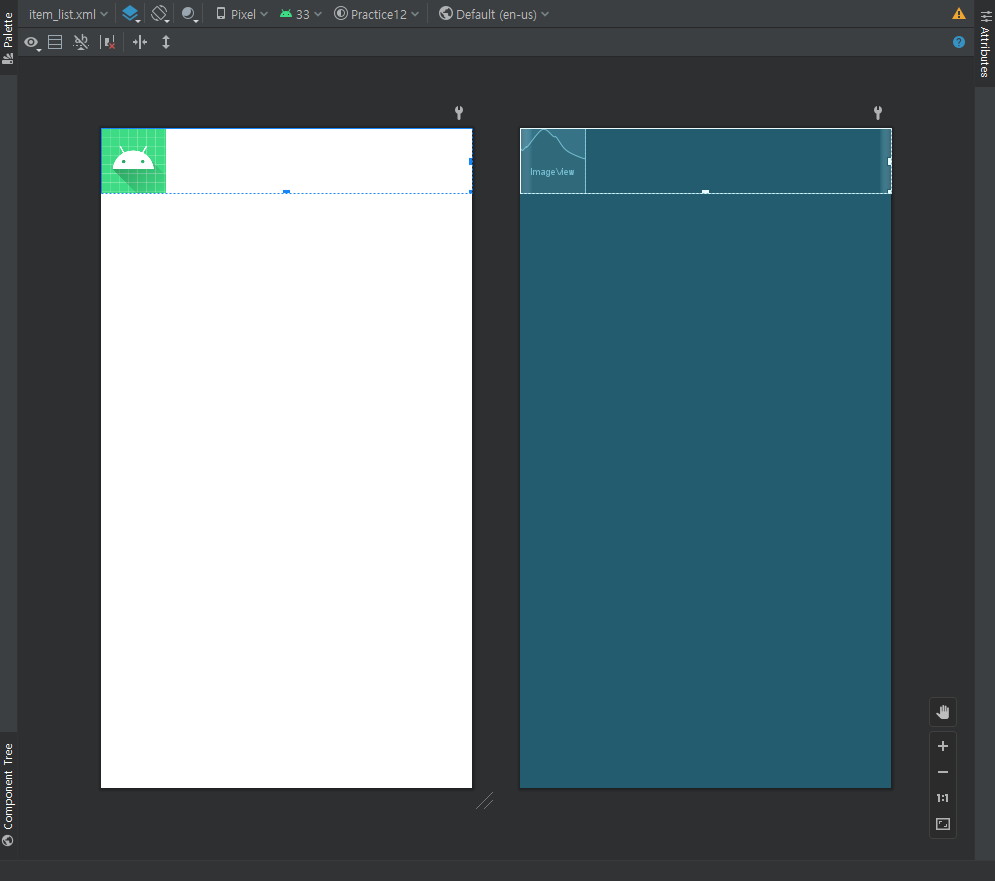 이제 이미지 옆에 들어갈 내용을 넣어보겠습니다. 'LinearLayout'을 추가해 'orientation'을 'vertical'로 설정합니다. 여기 안에는 'TextView'를 2개 넣어줍니다. 이 'TextView' 2개도 id를 설정해줍니다. 이렇게하면 레이아웃 구성이 끝났습니다.
