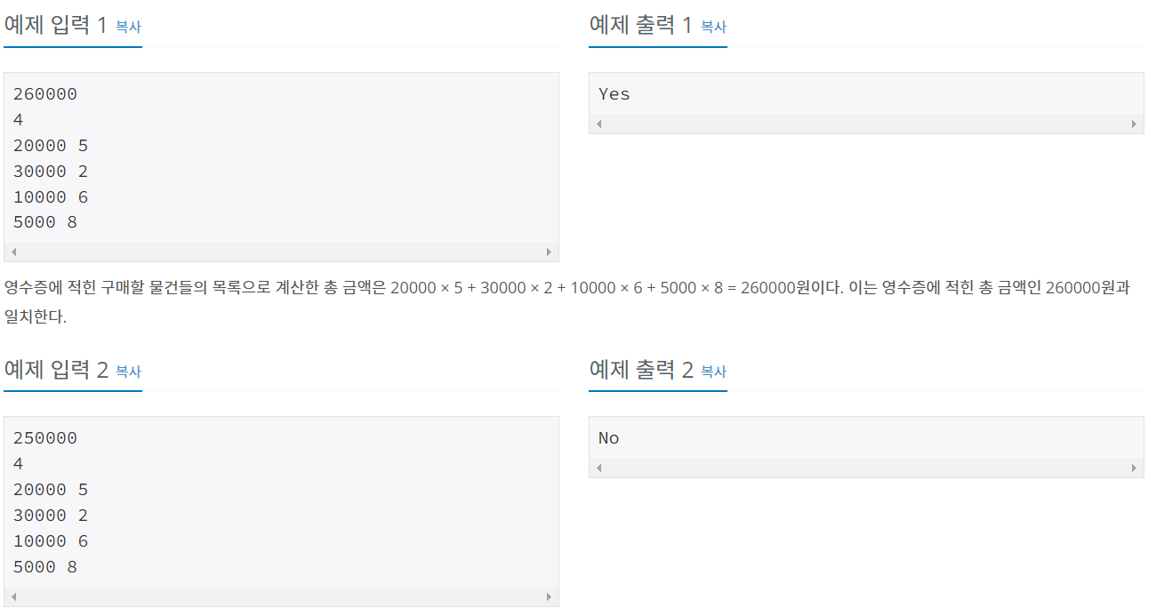 구매한 물건의 가격과 개수로 계산한 총 금액이 영수증에 적힌 총 금액과 일치하면 Yes를 출력한다. 일치하지 않는다면 No를 출력한다.
