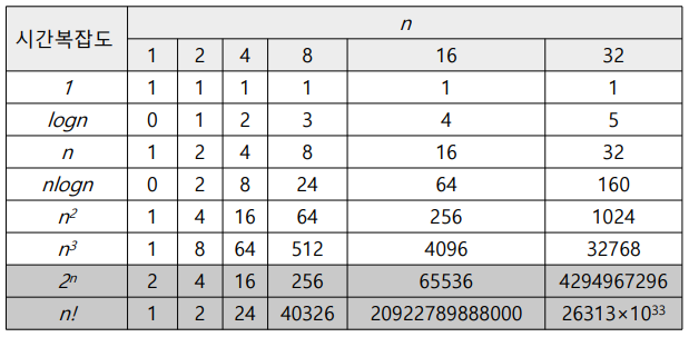 - 복잡도 분석 : 알고리즘을 직접 구현하지 않고 대략적인 효율성을 살펴보는 것