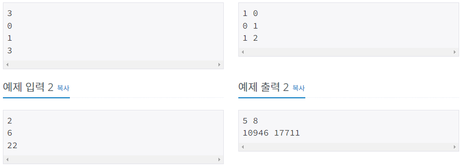 1은 2번 출력되고, 0은 1번 출력된다. N이 주어졌을 때, fibonacci(N)을 호출했을 때, 0과 1이 각각 몇 번 출력되는지 구하는 프로그램을 작성하시오.