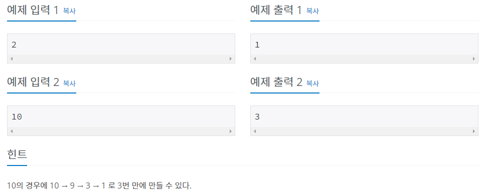 정수 N이 주어졌을 때, 위와 같은 연산 세 개를 적절히 사용해서 1을 만들려고 한다. 연산을 사용하는 횟수의 최솟값을 출력하시오.