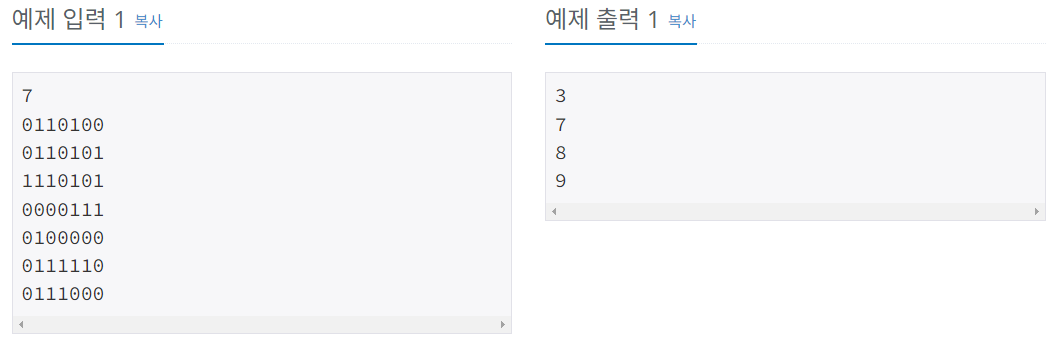 <그림 1>과 같이 정사각형 모양의 지도가 있다. 1은 집이 있는 곳을, 0은 집이 없는 곳을 나타낸다. 철수는 이 지도를 가지고 연결된 집의 모임인 단지를 정의하고, 단지에 번호를 붙이려 한다. 여기서 연결되었다는 것은 어떤 집이 좌우, 혹은 아래위로 다른 집이 있는 경우를 말한다. 대각선상에 집이 있는 경우는 연결된 것이 아니다. <그림 2>는 <그림 1>을 단지별로 번호를 붙인 것이다. 지도를 입력하여 단지수를 출력하고, 각 단지에 속하는 집의 수를 오름차순으로 정렬하여 출력하는 프로그램을 작성하시오.