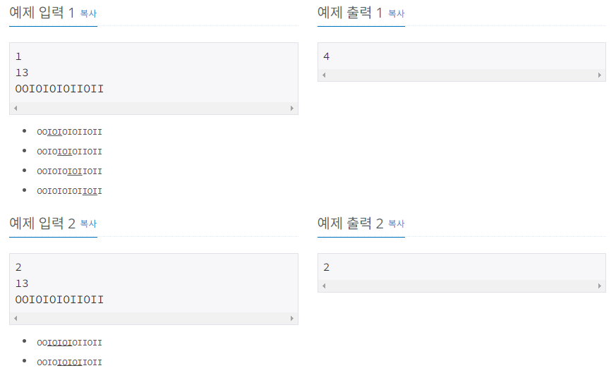 N+1개의 I와 N개의 O로 이루어져 있으면, I와 O이 교대로 나오는 문자열을 PN이라고 한다. P1 IOI P2 IOIOI P3 IOIOIOI PN IOIOI...OI (O가 N개) I와 O로만 이루어진 문자열 S와 정수 N이 주어졌을 때, S안에 PN이 몇