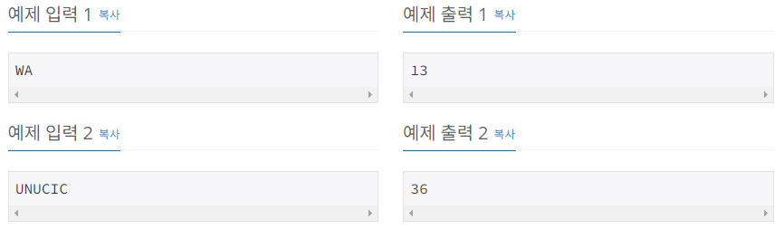 첫째 줄에 알파벳 대문자로 이루어진 단어가 주어진다. 단어의 길이는 2보다 크거나 같고, 15보다 작거나 같다.