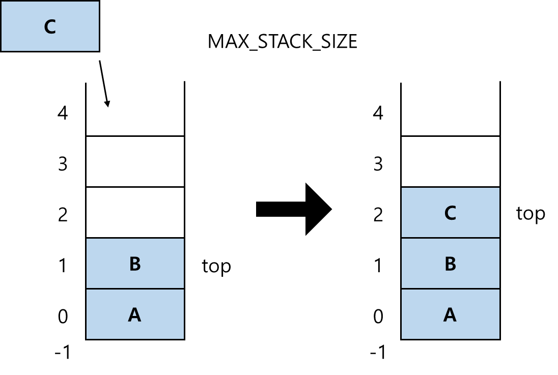 - 이때 top의 위치가 MAX_STACK_SIZE보다 크다면 삽입 연산 수행하지 못함.