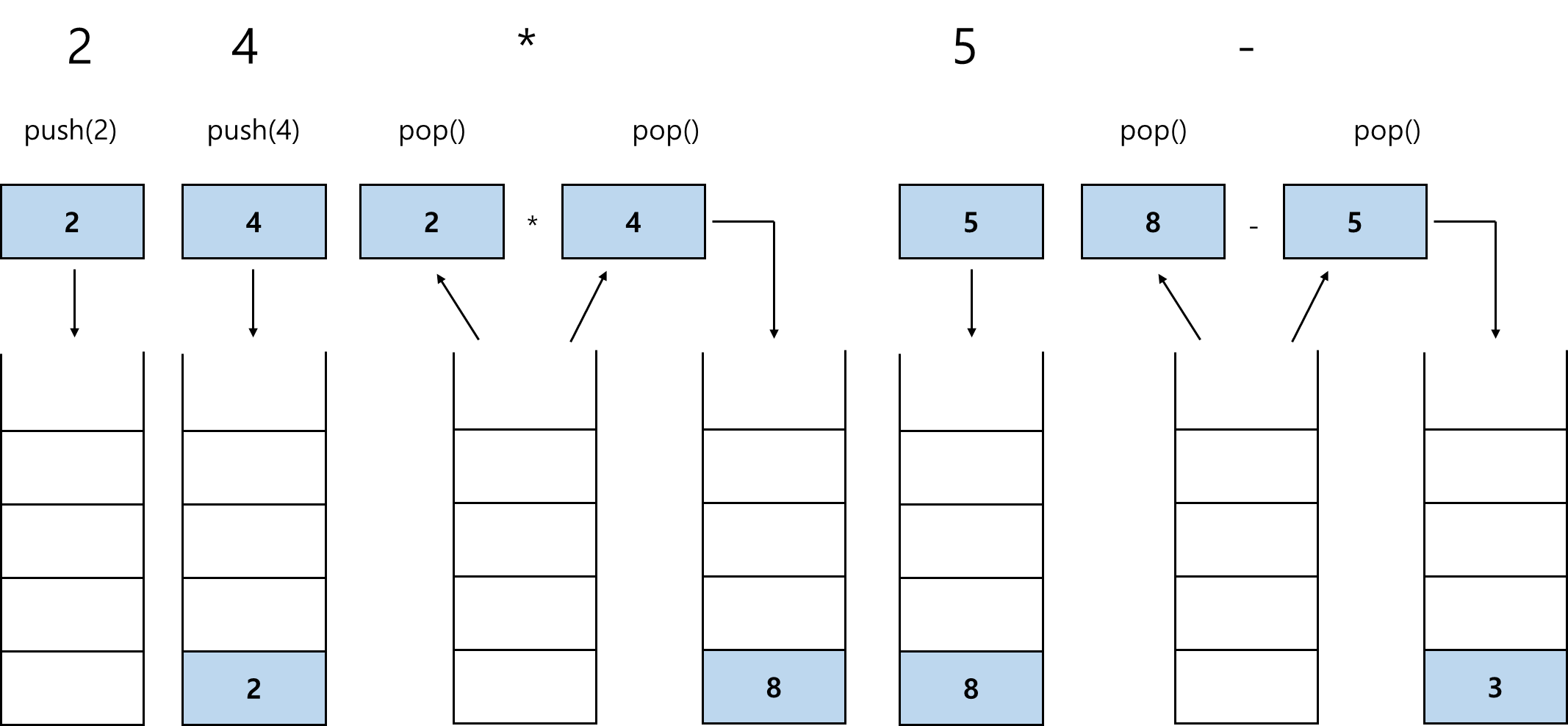 - 연산자가 나오면 스택에서 피연산자 두 개를 꺼내 연산을 실행한 후 그 결과를 다시 스택에 저장함.