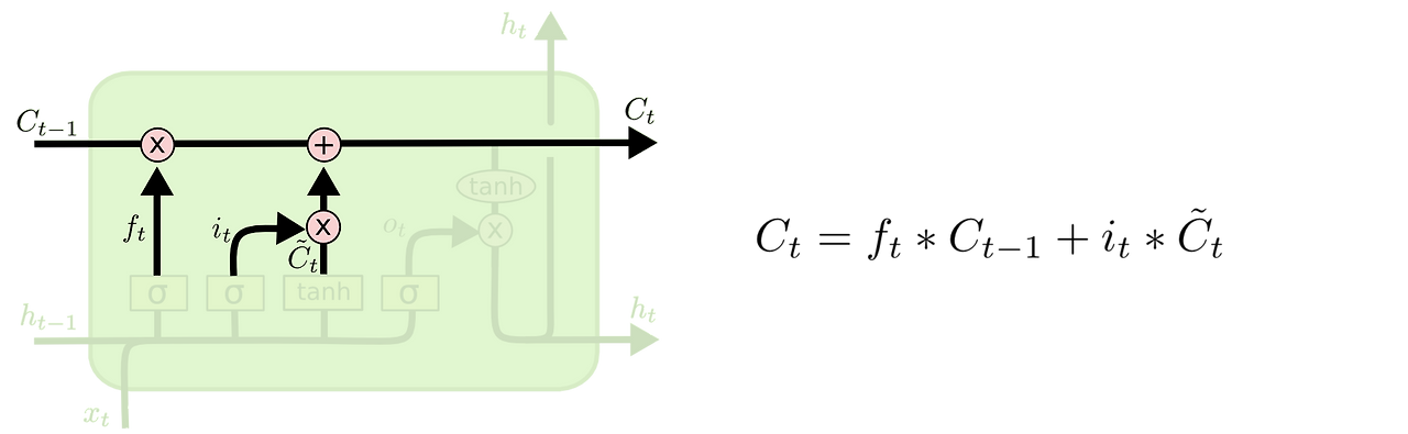 - '과거에서 유지할 정보' + '현재에서 유지할 정보'를 통해 현재 시점의 cell state를 업데이트 함