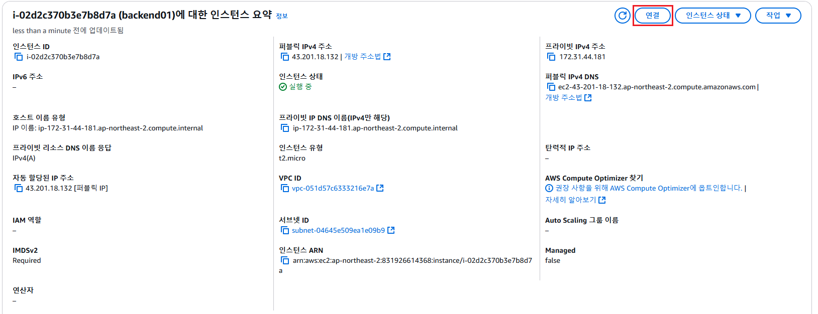 - AWS 사이트의 EC2를 클릭한 후 인스턴스 ID를 선택후 '연결'을 선택함