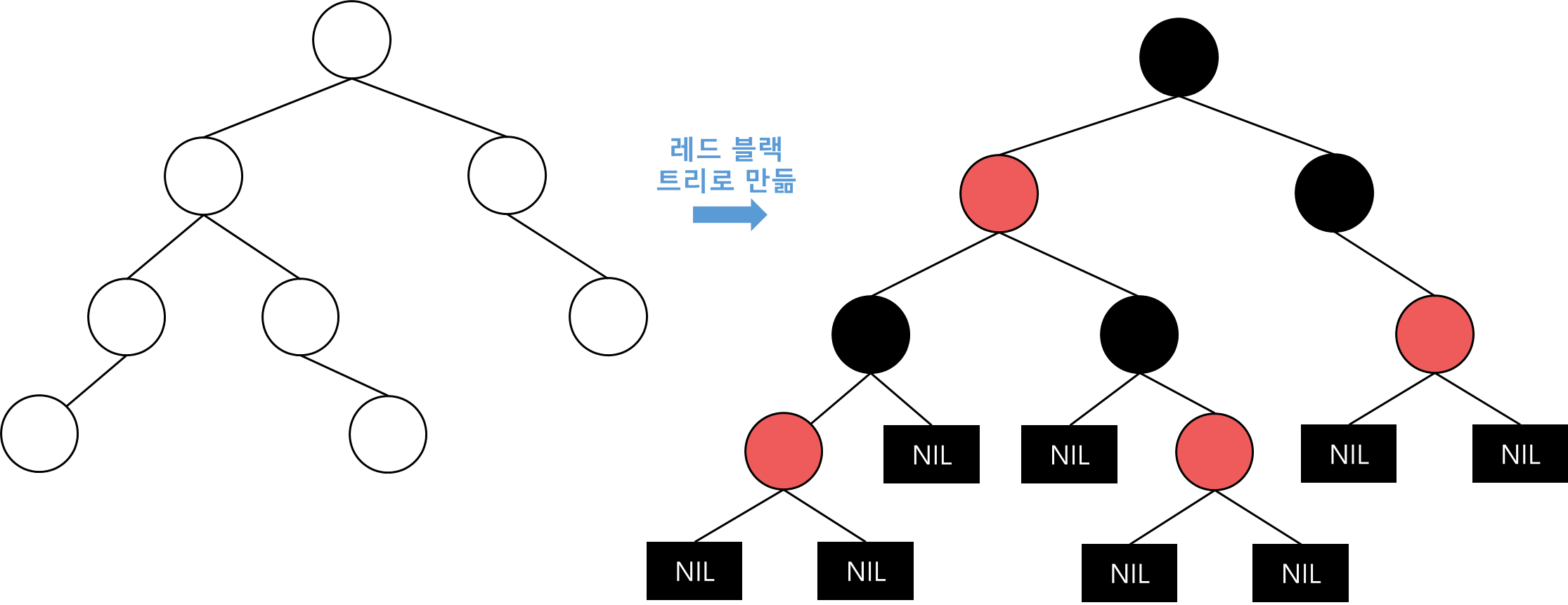 - 이진 검색 트리의 모든 노드에 레드 또는 블랙의 색상을 칠함.