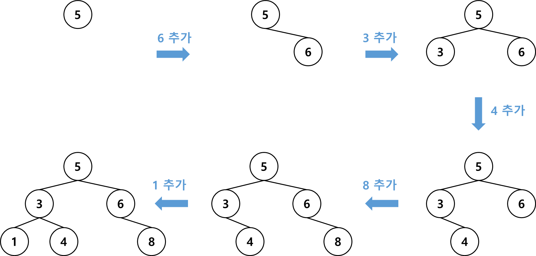 - 원소 x를 이진 검색 트리에 삽입하려면 이진 검색 트리에 x를 키 값으로 가진 노드가 없어야 함.