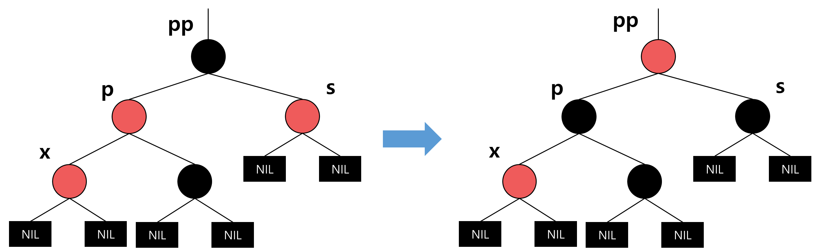 - p가 레드인 경우, p의 부모 노드 pp는 반드시 블랙임. 새 노드의 주변에서 레드나 블랙 두 가지가 다 가능한 것은 p의 형제 노드 s뿐임.